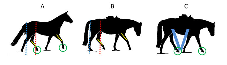 | Bild 2: Entwicklung eines Pferdes vom wenig trainierten Jungpferd (A) zum trainierten Reitpferd mit mehr Untertritt und Takt (B, C). |