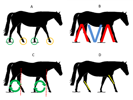 | Bild 1: Pferd im Jog. Was zeichnet einen guten Jog/Trab aus? A) Der Takt; die diagonalen Beinpaare sollten stets zeitgleich auf- & abfußen. B) Die gebildeten V’s zwischen den Voder-/Hinterbeinen (rot), sowie zwischen Vor- & Hinterhand (blau) soll-ten symmetrisch und die roten V’s gleichgroß sein. C) Die Beine sollten in der Luft immer eine gleichmäßig kreisende Bewegung vollziehen (grüne Pfeile); die Beine sollten zum Auffußen vor das Lot am Kniegelenk bzw. Buggelenk geführt werden (gestrichelte rote Linien). D) Die Parallelität der hinteren Röhre & des Oberarms des diagonalen Vorderbeins sollten in jeder Phase gegeben sein (gelbe Linien). |